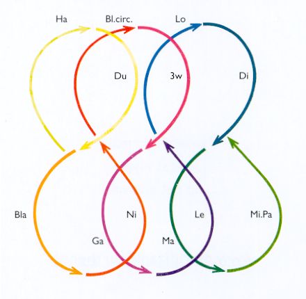 Weergave van de energiestroom door de opeenvolgende meridianen, in de kleur die een stimulerende invloed heeft.